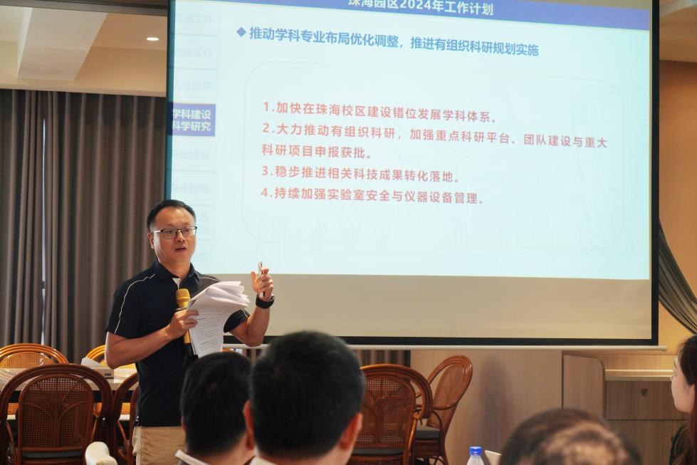 戴伟围绕重点工作、党建工作、人才培养工作、学科建设工作、科学研究工作、队伍建设工作、条件保障工作、国际及港澳台交流工作以及社会服务工作九个方面介绍了2024年珠海校区工作计划。